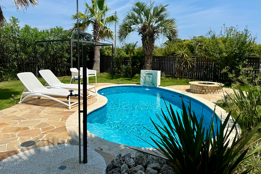 大きなウッドデッキと、バリ島ガゼボ、プールを施工