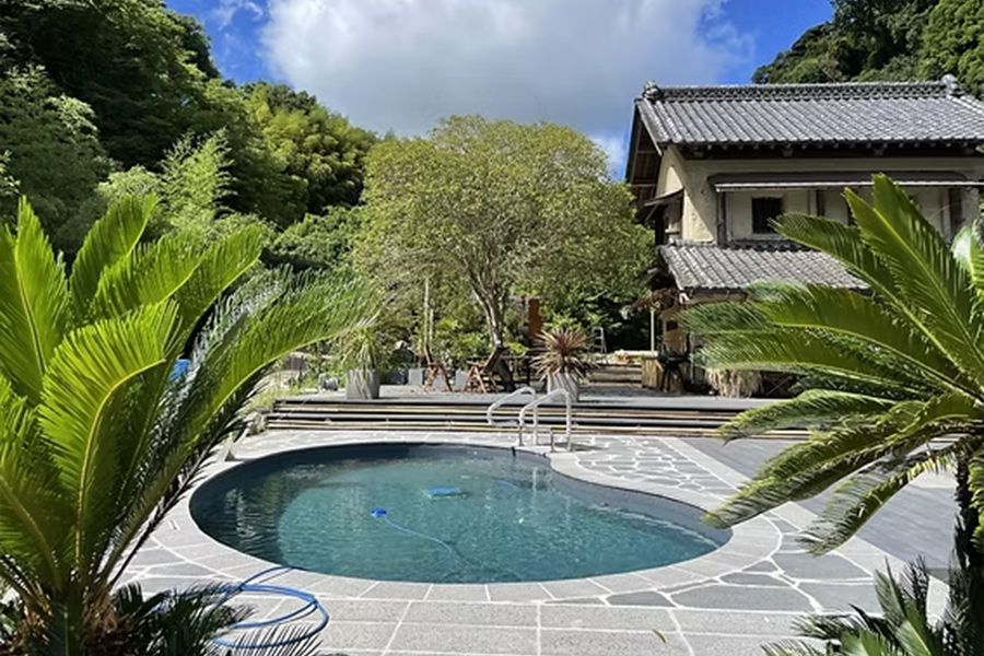 大きなウッドデッキと、バリ島ガゼボ、プールを施工